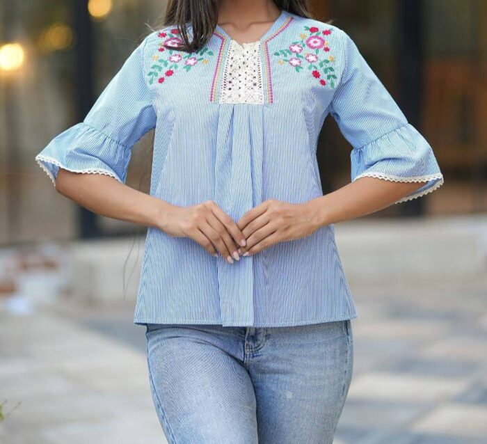 بلوز گلدوز نخ گیپور دار جنس:نخ نساجی قد:۶۲ دور سینه ۱۱۰ کشسانی ندارد قد آستین ۳۵ سایز 36 تا 44